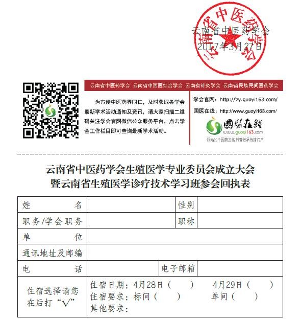 附件:云南省中医药学会生殖医学专业委员会成立大会暨云南省生殖医学诊疗技术学习班参会回执表