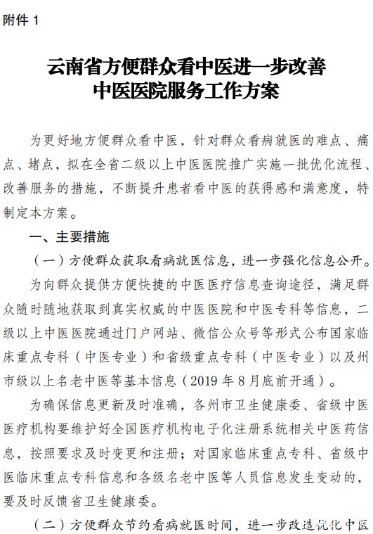 近日,国家中医药管理局下发了《关于方便群众看中医进一步改善中医医院服务的通知》,为贯彻落实国家要求,更好地方便群众看中医,云南结合“不忘初心、牢记使命”主题教育工作部署,针对群众看病就医的难点、痛点、堵点,以“优化流程、改善服务”为抓手,通过以下六个举措,全面改善全省二级以上中医医院服务,不断提升患者看中医的获得感和满意度。