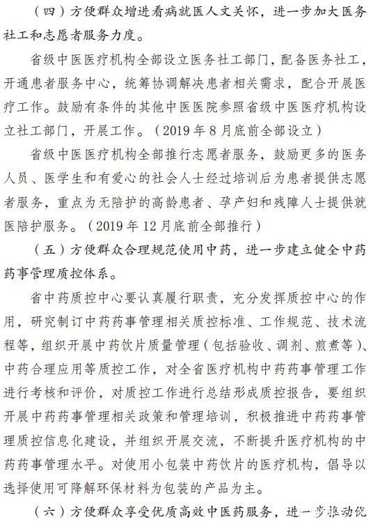 四是方便群众增进看病就医人文关怀,进一步加大医务社工和志愿者服务力度。省级中医医疗机构全部设立医务社工部门,配备医务社工,开通患者服务中心。全部推行志愿者服务。鼓励有条件的其他中医医院参照省级中医医疗机构开展工作。