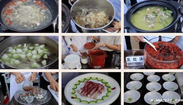 “上菜啦!一鸽胜九鸡,玉堂春暖,心有千千结,四神汤,五彩魏膳 ,三鲜固本汤……”