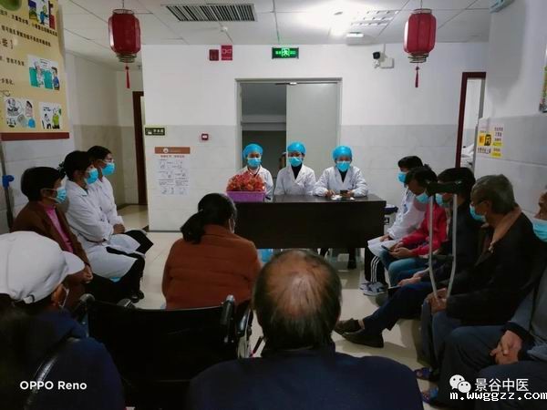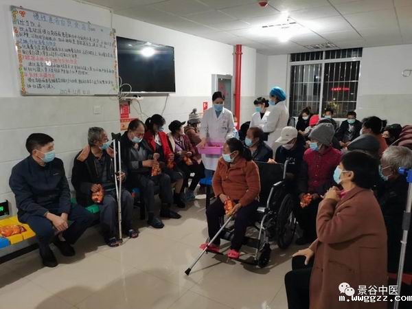 夜幕降临,热闹的元旦座谈会开始了,患者们有序坐好,腿脚不便的大妈也坐上了轮椅早早等候。座谈会开始,护士长为大家送上新年祝福,护士们一一送上新年福袋。