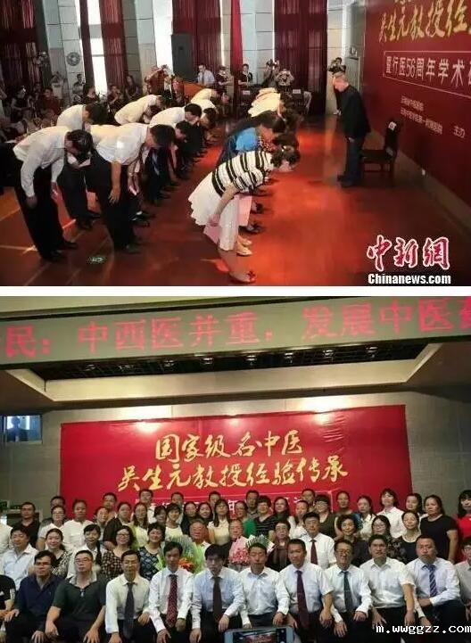 在众多嘉宾的见证下,吴生元正面而坐,30位弟子上前向吴生元三鞠躬,敬献鲜花,敬茶。弟子代表宣读了拜师贴,拜师贴以“昔扁鹊之遇长桑”的典故来表达自己拜师的心情,希望得到吴生元的教诲,继承他的学术思想和诊疗技术。