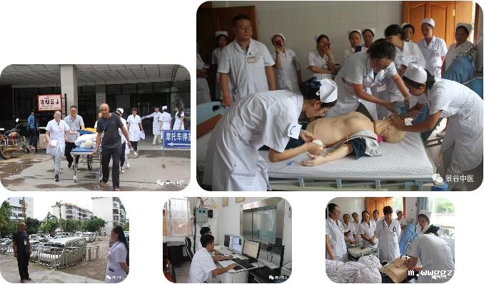 此次演练情景选取针灸科住院患者在卫生间门口不慎意外跌倒,护士巡视病房时发现患者跌倒,迅速启动医院患者跌倒应急预案。马上对其进行生命体征和伤情评估,立即通知医生处理,并告知家属,协助医生处理后汇报护士长。将患者移至抢救室观察病情变化,邀请外科医生会诊,治疗包扎伤口,开具相关检查。患者到达CT室时,情景设置突然停电,医院立即启动备用电源,对患者进行检查。检查完毕返回抢救室途中,患者出现心慌、胸闷、出汗等不适症状。到达抢救室后,患者突发心跳、呼吸骤停,医护人员按照心跳、呼吸骤停抢救流程实施抢救,同时紧急邀请内科主任进行急会诊。通过全力抢救,患者心跳、呼吸恢复,经内科医生会诊,该患者病情较重需转内科继续治疗。整个演练过程全体人员各司其职,互相协作,积极配合,现场气氛紧张、严肃、有序。
