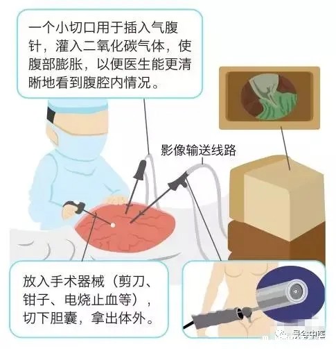 是指在腹部切三到四个小切口,在肚脐眼切口注入二氧化碳气体,使腹部膨隆,接着在脐眼切口插入一个1cm的套针,放入腹腔镜,将腹腔内的画面传到电脑上,在另外的切口,插入手术操作钳,依靠操作钳来完成胆囊切除术,切除的胆囊由剑突下切口拉出。