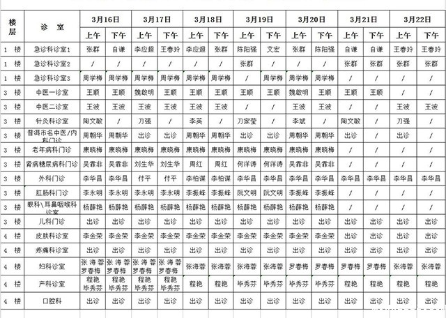 2020年3月16日—3月22日门诊出诊表