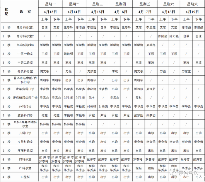 4月13日—4月19日门诊出诊表