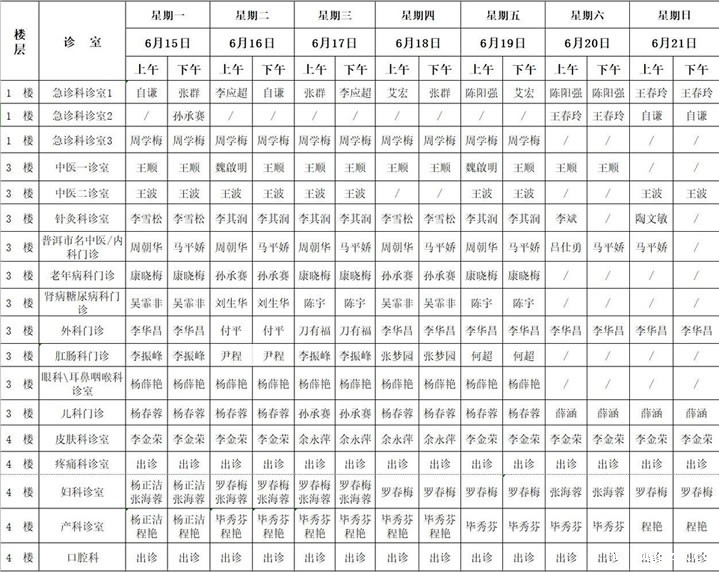 6月15日—6月21日门诊出诊表