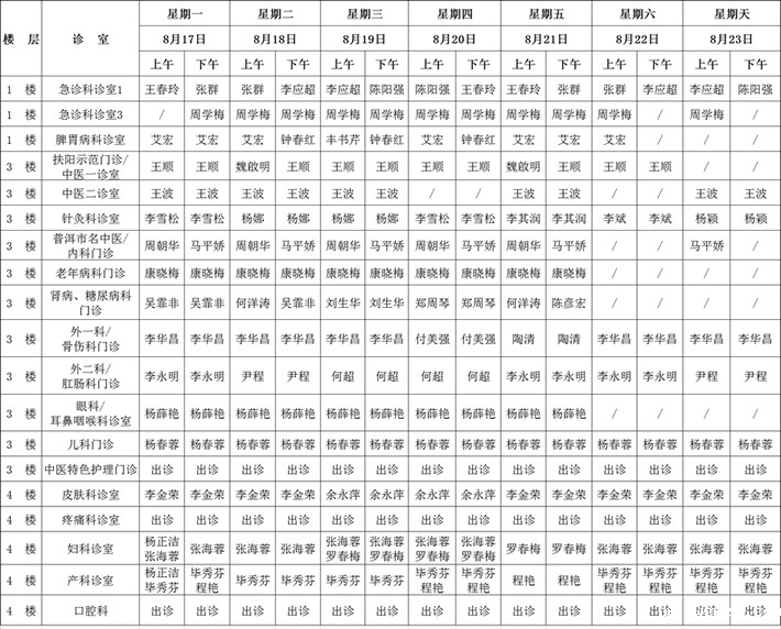 8月17日—8月23日门诊出诊表