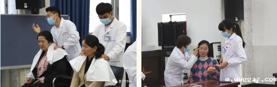 义诊团队为公司职工们量血压、测血糖,认真细致问病查体评估身体健康状况,根据个人情况为其提供推拿按摩、耳穴压籽、刮痧等中医适宜技术治疗和健康咨询服务,并针对合理饮食、适当锻炼等养生知识进行宣教。