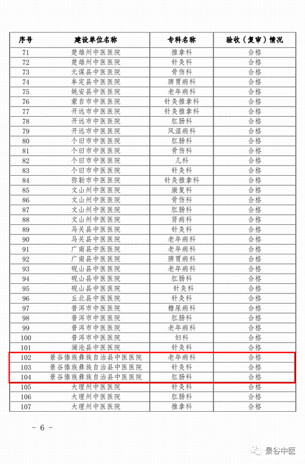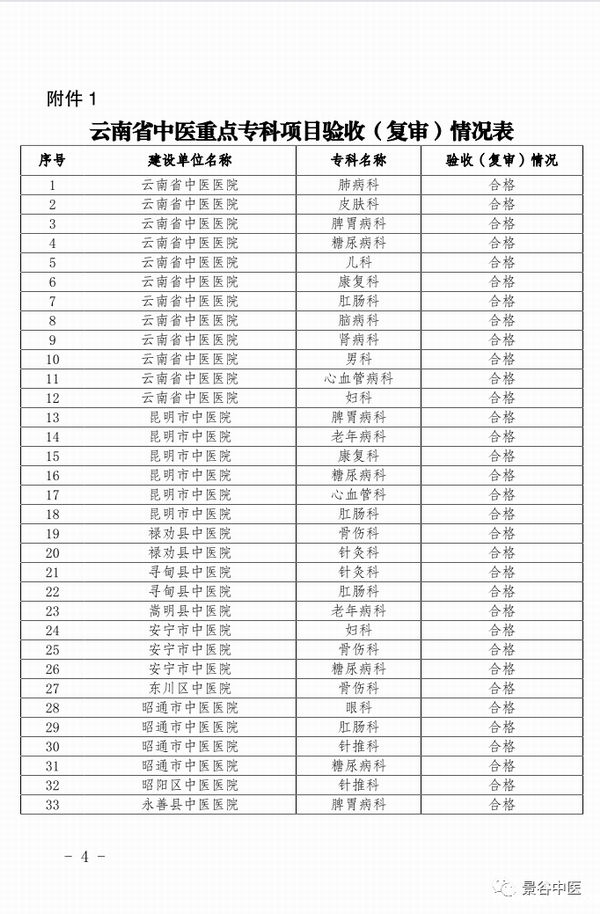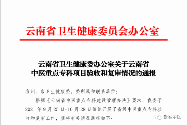 近日,云南省卫生健康委办公室下发了《云南省卫生健康委办公室关于云南省中医重点专科项目验收和复审情况的通报 》,我院老年病科、针灸科、肛肠科顺利通过云南省中医重点专科项目验收(复审),标志着我院专科建设水平又迈向了一个新台阶。