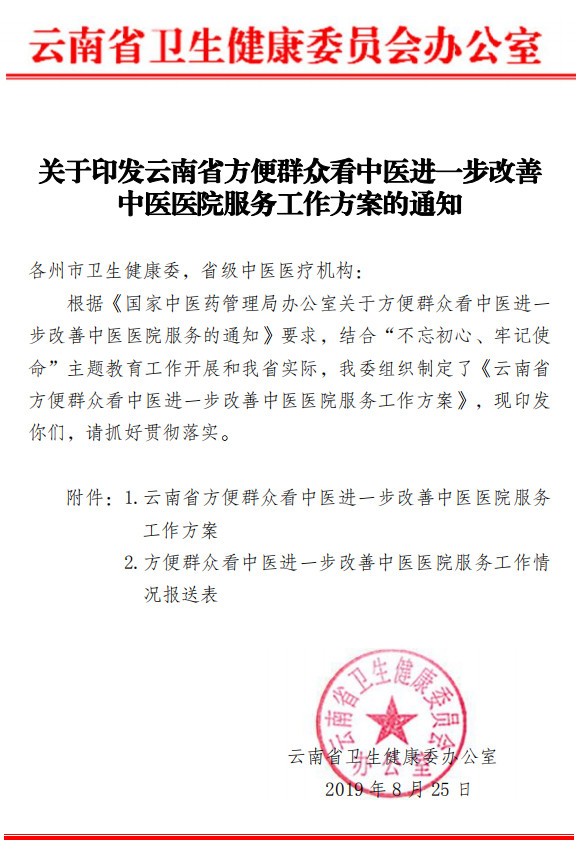 近日,国家中医药管理局下发了《关于方便群众看中医进一步改善中医医院服务的通知》,为贯彻落实国家要求,更好地方便群众看中医,云南结合“不忘初心、牢记使命”主题教育工作部署,针对群众看病就医的难点、痛点、堵点,以“优化流程、改善服务”为抓手,通过以下六个举措,全面改善全省二级以上中医医院服务,不断提升患者看中医的获得感和满意度。