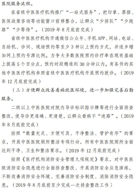二是方便群众节约看病就医时间,进一步改造优化中医医院服务流程。在省级中医医疗机构推广“一站式服务”,把印章、票据、医保政策咨询等功能窗口前移整合,让群众“少排队”“少跑路”“少等待”。并开通至少3种以上预约方式,逐步增加网上预约号源比例。力争大多数医院预约诊疗率在现有基础上提高5个百分点,预约时段精准到30分钟以内。