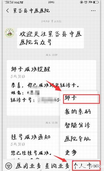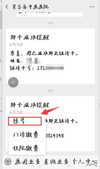 绑卡成功之后,点击页面下边【医疗业务】→【挂号】,选择挂号科室及医生,进行挂号并付款。在线完成挂号和缴费后,到医院凭身份证直接到相关科室就诊即可。