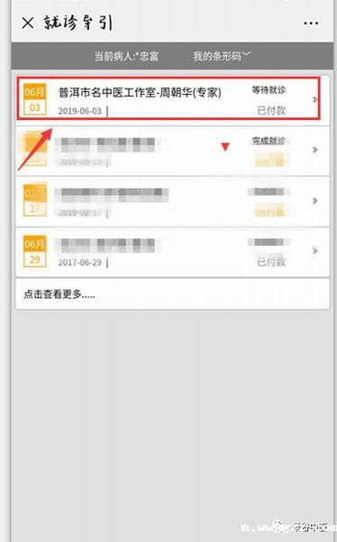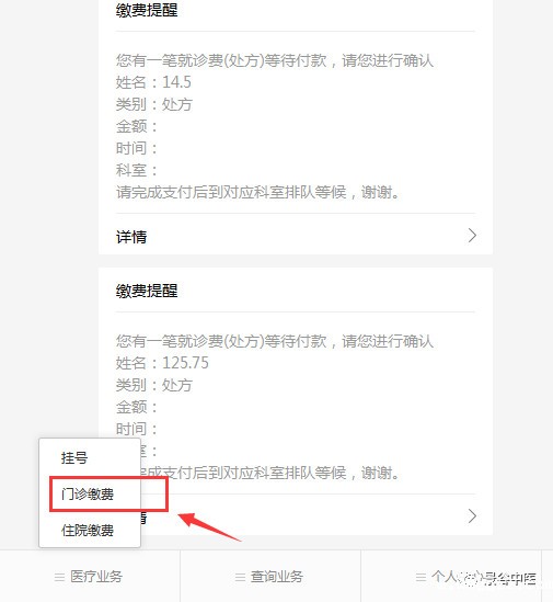 2. 选择2【就诊时间】,切换不同的就诊记录。当用户存在多次就诊都有未付款的单据时,可以通过此处进行选择;