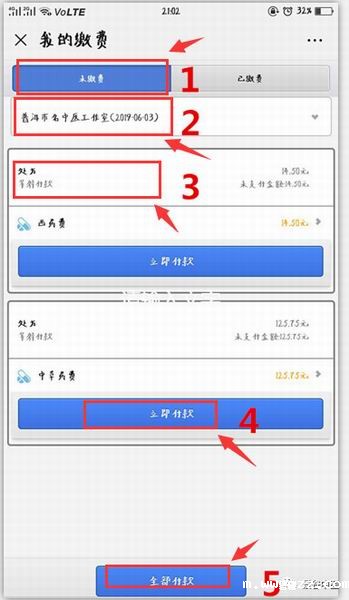 1.通过选择页面顶部1【未缴费】/【已缴费】,对该次就诊的缴费情况进行切换;