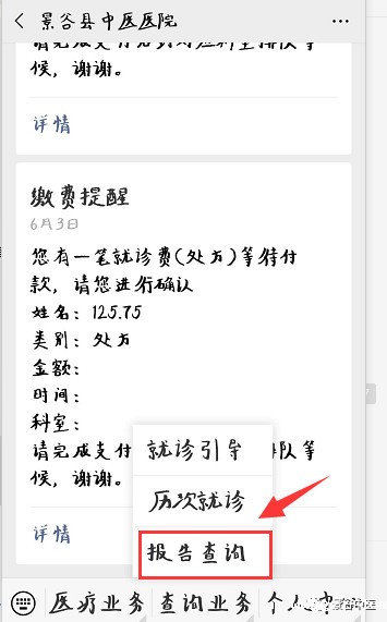 点击【查询业务】里子菜单,可查看门诊就诊记录、检查报告等。当前报告完成时,将向用户推送消息进行通知,用户可直接在该处查询最新报告结果。