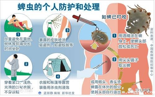 治疗:一旦被咬尽快到医院进行治疗,千万不可以自行在家摘除。蜱咬伤出现的皮炎主要是消炎、止痒、止痛,同时给予对症处理。病原学治疗应及早使用抗生素,避免出现并发症,对疑似病例可进行经验性治疗。一般慎用激素类药物,以免加重病情