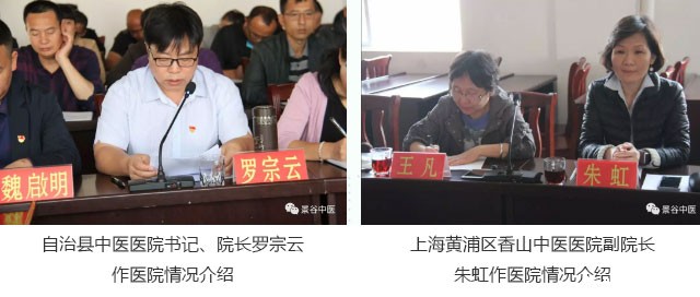 会议,首先由自治县中医医院书记、院长罗宗云同志作医院情况报告,并对上海黄浦区香山中医医院的到来表示了由衷的感谢和最真切的期盼。其次,上海黄浦区香山中医医院副院长朱虹作医院情况汇报,并对此次合作寄予最美好的期望。最后,自治县人民政府副县长李梅,针对此次对口支援帮扶工作提出帮扶需求,同时对自治县中医医院提出了新的更高的要求。